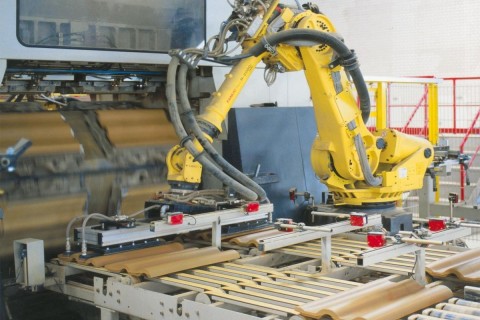 Due to their preparation water content and their shape and size, roof tiles are also exposed to the risk of being deformed during loading and unloading of the roof tile press. Robots and grippers for loading and unloading roof tile presses must therefore also be particularly designed for a careful handling of the products.