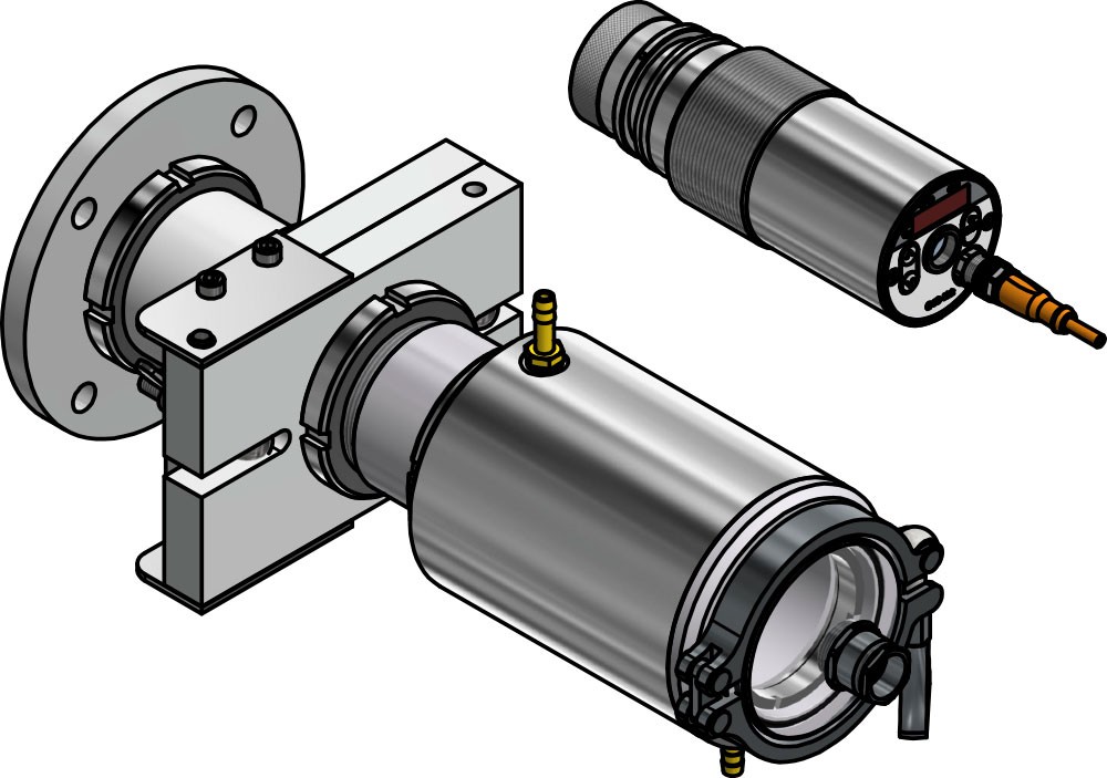 • Pirómetro de cociente con óptica enfocable en carcasa de acero inoxidable